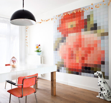 Все эти настенные панно-картины созданы их керамической плитки. На самом деле подобную идею можно воссоздать из различных материалов. Посмотрите, как например можно сделать оригинальное украшение на стену из разноцветных стикеров.